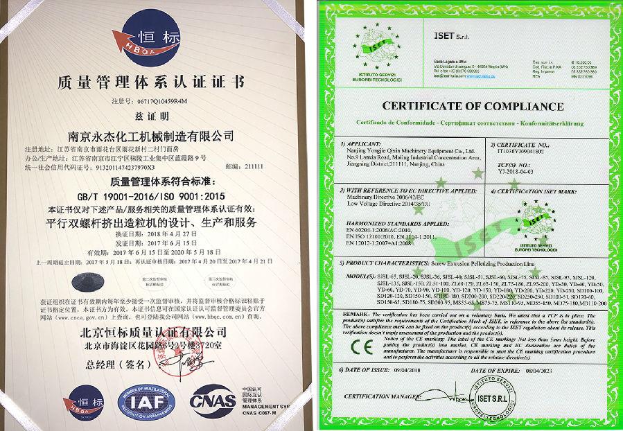 我司的所有造粒機組產(chǎn)品均通過(guò)了CE和ISO9001認證,質(zhì)量有保障: